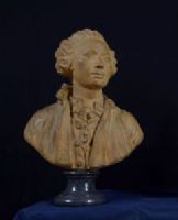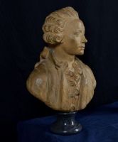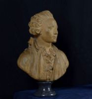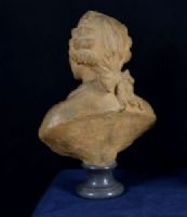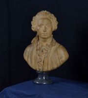 Terracotta bust depicting a nobleman, marble base, France 19th century Dimensions: cm H 63 x W 43 x D 24 cm Private negotiation Object accompanied by a certificate of authenticity The refined bust depicts a nobleman dressed according to mid-18th century fashion in France. The man wears his hair tied in a ponytail secured with a ribbon. He wears an open jacket that showcases his elaborate Rococo-style shirt. The bust bears the signature of Augustin Pajou Paris and is dated 1725.The sculpture rests on a marble base with a circular section.