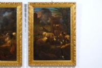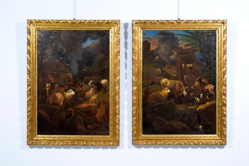 Pair of paintings depicting Landscapes with herds, Govaert Gabriel VAN DER LEEUW, signed and dated 1681 Second half of the 17th century, oil on canvas Measurements: cm W 91 x H 123 x D 6; canvas: cm W 72 x H 103.5 Price: confidential negotiation Object accompanied by a certificate of authenticity The pair of fine paintings, made in oil on canvas and presented inside carved and gilded wooden frames from the 19th century, depict two landscapes with cows, sheep, dogs and figures near villages. In both compositions, the groups of farm animals are represented in the foreground, in an outdoor environment, with rocks, small shrubs and roots, some tall trees and palm trees, and some architectural ruins. In the background, the activity of villages is described with vivacity and a swarm of small figures engaged in daily tasks. In one canvas, the lighting of a fire, in the other the storm with lightning that marks the horizon, are the pretext for depicting large gray clouds that create a strong contrast with the intense blue of the sky. The light that is created, strongly theatrical and twilight, envelops the atmosphere with shadows. Only a few luminous rays highlight some animals, whose golden fleece emerges from the brown colors that characterize the whole. The works are signed and dated "G. Leone fecit 1681". This is a Dutch painter of herds and landscapes of the Golden Age, active in the second half of the 17th century, named Govaert Gabriel VAN DER LEEUW (Dordrecht 1645-1688). However, the artist is also known as Gabriel de Lione, Grechetto da Leone, Monsù Leone. Van der Leeuw was the son of Bastiaen Govertsz van der Leeuw and Sybilla van Nieuwstadt. He learned to draw from his father, together with his brother Peter. In 1661 he went to Amsterdam, where he married the sister of the painter David van der Plaats. He then began to travel in Europe, to Lyon and Paris, staying at the Savoy court for two years, visiting Madrid, Rome and Naples. After a brief return to his homeland, he decided to return to Rome and Naples, cities in which he had the greatest success. And it was in Italy that he nicknamed himself "Gabriel de Leone", translating the Dutch surname. In Paris he was known as "peintre ordinaire du Roi" or "Gabriel de Lyon". His works feature different signatures (gdv leeu or G de Leone) depending on where he made them. The two works presented here, and therefore executed during his Italian stay, fit well into the artist's catalog, which reflects that taste widespread throughout Europe in the 17th century but much appreciated in Rome, exemplarily represented by Giovanni Benedetto Castiglione, Rosa da Tivoli and Johann Heinrich Roos, to whom Van der Leeuw certainly related to then find his own original artistic expression. The paintings, in good condition, have a relining of the 19th century.
