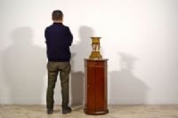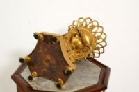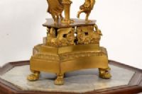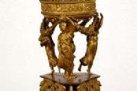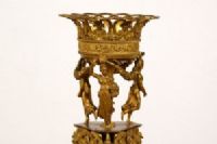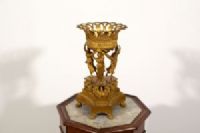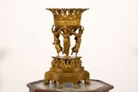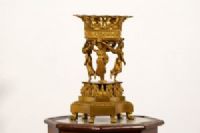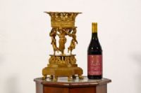 Centerpiece in chiseled and gilded bronze, France, Empire period, early 19th century Measurements: cm H 36 x diameter 23 Price: private negotiation Item accompanied by our certificate of authenticity This refined centerpiece was made in France in the early 19th century, Empire period, in finely chiseled and gilded bronze. The base with six claw feet, hexagonal in section with concave sides, is decorated with palmette motifs. Above, three figures of swans with open wings, on which a surface rests, are interspersed with phytomorphic decorative elements. The central part of the centerpiece consists of a fluted vertical element around which three female figures dance, connected to each other at the top by lavish garlands. The three maidens can be identified with the three Graces (Aglaia, Euphrosyne and Thalia), Daughters of Zeus and the nymph Eurynome, in Roman mythology. Personifying beauty and feminine grace, they symbolize splendor, joy and prosperity. Here represented in ancient dress, they are each different from the other, accompanied by a vase full of fruit, vine decorating the hairstyle, small flowers. Their dancing attitude, on tiptoe, with raised arms, gives greater movement and lightness to the whole. The central column and the three maidens support the top part of the centerpiece, consisting of a band decorated with bas-reliefs with vine shoots and a perforated basket composed of phytomorphic elements and scrolls. The centerpiece as a whole has a graceful and luminous composition, very decorative and elegant. Easily placed as a flower or fruit centerpiece on tables, coffee tables, columns, chests of drawers, guéridons and consoles, it can be combined with both antique and modern furnishings.