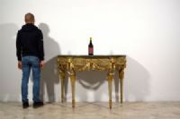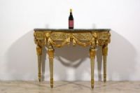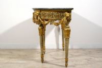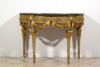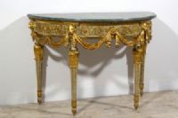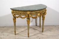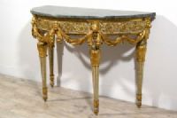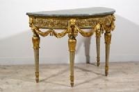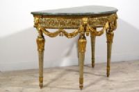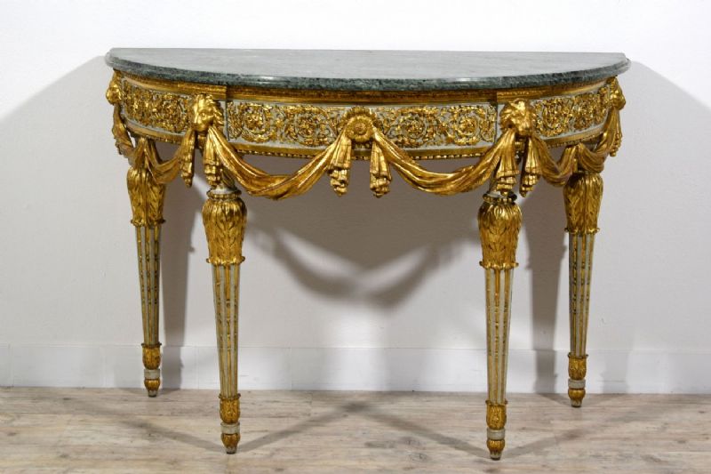 Bedeutende und seltene neoklassizistische Halbmondkonsole aus geschnitztem, lackiertem und vergoldetem Holz, Turin, Francesco Bolgiè zugeschrieben, Ende des 18. Jahrhunderts. Maße: H 92 x B 130 x T 66 cm Preis: Verhandlungssache Objekt mit Echtheitszertifikat Diese wertvolle und raffinierte Konsole wurde in der neoklassizistischen Epoche in Turin gegen Ende des 18. Jahrhunderts gefertigt. Sie ist elegant nach den Kanonen der Turiner Haute Ébénisterie geschnitzt und weist deutliche stilistische Ähnlichkeiten mit den Werken von Francesco Bolgiè auf. Die architektonische Struktur der Konsole als Ganzes und vor allem in einigen Details, wie z. B. die subtilen Ranken, Akanthusblätter und Löwenköpfe, sind charakteristisch für die Arbeiten des Bildhauermeisters. Sie hat eine Halbmondform und eine Platte aus grünem Alpenmarmor mit profiliertem Rand. Die Untertischzarge ist oben durch einen mit Blattmotiven geschnitzten und unten durch eine glatte Holzleiste begrenzt, während unten auf die glatte, vergoldete Holzleiste eine mit Halbkugelmotiven geschnitzte Leiste folgt. Das zentrale Band ist aus lackiertem Holz mit sehr raffinierten Schnitzereien in Form von Ranken und pflanzlichen Elementen im klassizistischen Stil. Der Farbton des Lacks, Grau-Blau, ist charakteristisch für das Piemont, sowohl für Möbel als auch in historischen Palästen. In der Nähe der vier Beine ist die Zarge mit hochreliefartigen, vergoldeten Holzschnitzereien verziert, die Löwenköpfe darstellen, die mit ihren Fängen elegante Tücher halten, die sanft nach unten fallen. In der Mitte der Zarge ist stattdessen eine große Blüte mit runder Krone geschnitzt, in die die Drapierungen zusammenlaufen und sich verflechten. Die vier Beine entspringen einem blau lackierten Holzkapitell mit goldenen, kreisförmigen Verzierungen. Die Beine weisen dann eine reiche Schnitzerei in Form von vergoldeten Akanthusblättern auf, von denen der Schaft in Form eines umgekehrten Kegelstumpfes ausgeht, der lackiert und in den Rillen vergoldet ist. Unten bilden erneut Akanthusblattschnitzereien und ein runder Fuß mit lackierter und vergoldeter Holzspitze den Abschluss der Beine. Die künstlerische Persönlichkeit des “Königlichen Holzbildhauers” Francesco Bolgiè (Turin 1752-1834) steht an der Spitze der Turiner Holzskulptur im letzten Viertel des 18. Jahrhunderts und in den ersten Jahrzehnten des 19. Jahrhunderts und spielte eine sehr wichtige Rolle in der dekorativen neoklassizistischen Holzskulptur. Er war ein Künstler von ähnlichem Rang wie Giuseppe Maria Bonzanigo, blieb aber lange Zeit im Schatten. Viele seiner Werke wurden aufgrund stilistischer Vergleiche Bonzanigo zugeschrieben, da es an genauen Archivrecherchen mangelte. Das Korpus der gefundenen Archivdokumente hat es in den letzten Jahren ermöglicht, die Figur dieses bedeutenden Schnitzers zu umreißen, sein Leben zu rekonstruieren und seinem Katalog mehrere Werke zurückzugeben, von denen viele noch im Palazzo Reale in Turin und in der Palazzina di Caccia di Stupinigi aufbewahrt werden, andere in berühmten Privatsammlungen.
