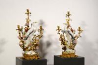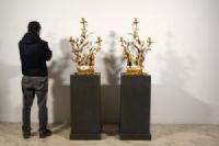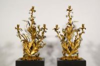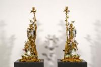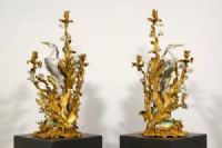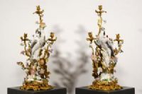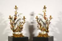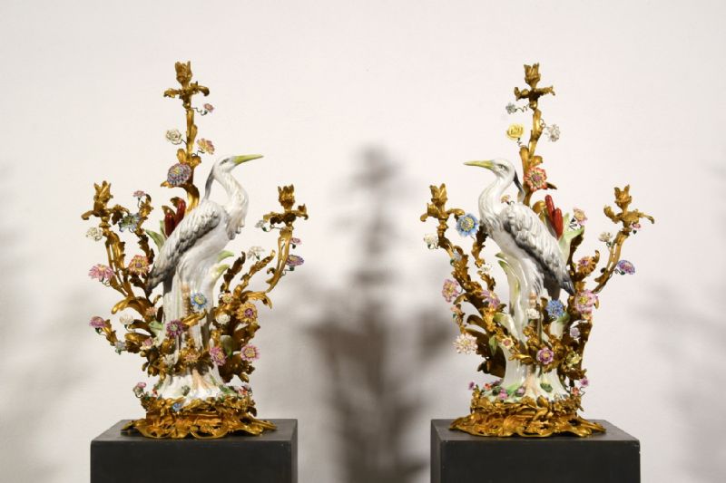 Pair of large three-light gilded bronze candelabras with herons and polychrome porcelain flowers, France, 19th century Measurements: cm H 82 x W 50 x D 34. base 35 x 34 cm Price: private negotiation Item accompanied by our certificate of authenticity The pair of large candelabras was made in France in the 19th century in chiselled and gilded bronze, adorned with figures of herons and floral decorations in hand-painted polychrome porcelain. Executed in the Louis XV style, they feature a pierced base in chiselled gilded bronze with rocaille motifs composed of scrolls and phytomorphic elements. The porcelain heron figures rest on the base, around which branches with gilded bronze leaves develop, to which various polychrome porcelain flowers are attached. The three branches end with leaf-shaped bobeches and bud-shaped candle holders in bronze. The typology and conformation of the three-flame candlesticks, with phytomorphic arms on a mixtilinear base, dates back to rocaille models of the Louis XV style on which Meissen porcelain was mounted, to which the flowers and herons clearly refer. Very decorative and pleasant in size and decoration, these candelabras can be displayed, even as sculptures, on chests of drawers, consoles, gueridons and small tables, even in the center of rooms, observable from different angles. With the addition of one or more lampshades, they can also be adapted into lamps.