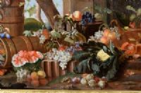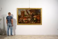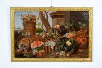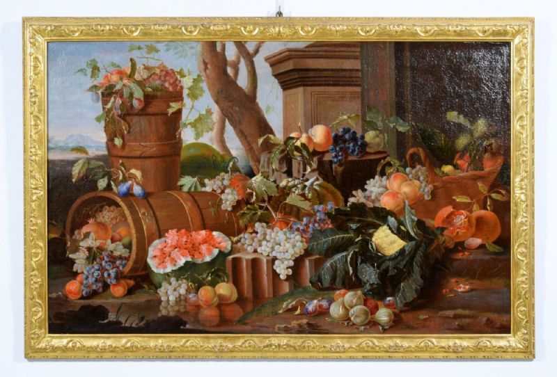 Pietro Navarra (Rome, active 1685 - 1714), Still Life oil on canvas; canvas dimensions: cm H 103 x W 164 – dimensions with frame: cm H 121 x W 182 x D 7 price: confidential negotiation item accompanied by a certificate of authenticity The painting, executed in oil on canvas, depicts a still life with a lush composition of fruit arranged in an open space with wooden barrels, wicker baskets, and architectural elements. The work is clearly attributable to Pietro Navarra, an artist active in Rome from 1685 to 1714. The latest studies on this artist's painting are by Ulisse and Gianluca Bocchi, whose work helps to define Navarra's style and artistic path. An eclectic painter, a pupil of Franz Werner von Tamm (Hamburg, 1658 – Vienna, 1724) and Christian Berentz, a Hamburger active in Rome in the first two decades of the eighteenth century, he distinguished himself for his depiction of still lifes. This painting perfectly reflects the typical characteristics of Pietro Navarra's painting. Indeed, his quality and chromatic richness, Navarra's skill, and his virtuoso brushstrokes in the rendering of the fruit can be found. The composition appears rich and well-balanced. The work is therefore characterized by the admirable artistic quality and the marked decorativeness of the subject; a pleasant and always current painting, suitable for any public or private environment.