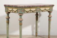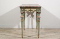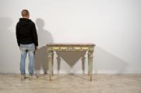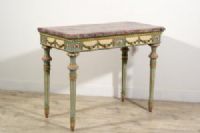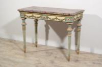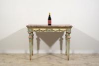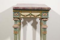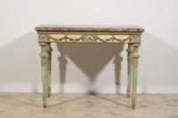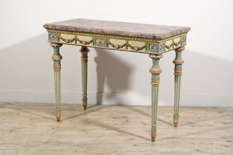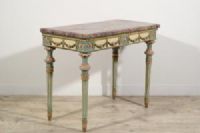 Questa elegante consolle è stata realizzata in epoca neoclassica, nella seconda metà del XVIII secolo a Milano. La struttura è in legno finemente intagliato e laccato in policromia.