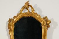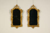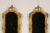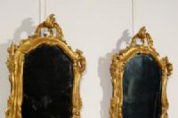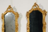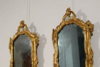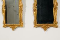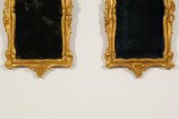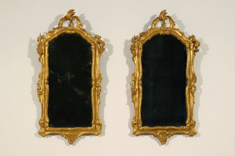 Paire de miroirs en bois sculpté et doré, Venise, seconde moitié du XVIIIe siècle, Louis XV Mesures : cm H 75 x L 38 x P 5,5 Prix : négociation privée Objet accompagné d'un certificat d'authenticité Cette précieuse paire de miroirs a été réalisée à Venise dans la seconde moitié du XVIIIe siècle. Le cadre en bois doré est richement sculpté de motifs rocaille, avec des volutes et des éléments phytomorphes. Les décors ne répondent pas à une symétrie entre les côtés, ce qui anime le décor et culmine en haut avec un petit faîte ajouré. Ceci est très particulier. Ce type de décor rend la paire très décorative, adaptée à tout environnement, moderne ou ancien, auquel elle apportera chaleur et luminosité grâce à la finition à la feuille d'or.