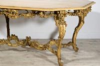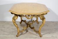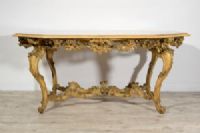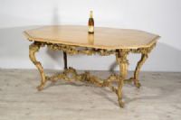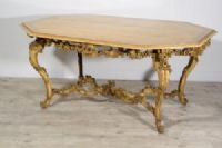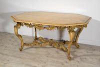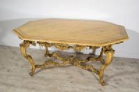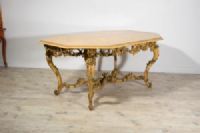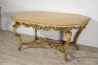 Mesa de centro em madeira esculpida, lacada e dourada, Turim, estrutura do século XVIII Medidas: cm L 179,5 x P 122 x A 80 Preço: negociação reservada Objeto acompanhado de certificado de autenticidade Esta particular mesa de centro é realizada em madeira finamente entalhada com ricos decorações florais, dourada e lacada em ocre. A faixa sob o tampo possui um ornato vazado com volutas, elementos fitomorfos e de gosto rocaille, característicos da época Luís XV. As pernas são arqueadas e movidas, e terminam com pé em forma de caracol. Entre elas estão unidas por travessas cruzadas que criam um refinado jogo graças à riqueza dos entalhes. A estrutura é realizada com material antigo de manufatura turinense do século XVIII. O tampo, de forma oblonga e octogonal, foi realizado nos primeiros anos do século XX, em madeira tratada com imitação de mármore amarelo. A mesa é elegante e muito decorativa, facilmente combinável, graças à coloração clara, com mobílias tanto antigas quanto modernas. Pode ser utilizada em uma sala de jantar. Devido à forma insólita do tampo, é uma mesa que pode também ser exposta em ambientes como salas de estar ou escritórios, como espaço de apoio ou escrivaninha.