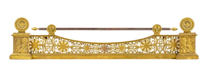 Gilt bronze fireplace gallery, France, early 19th century Initials B.d. on the back. Measurements: W 112 x H 26 x D 7. extended max. W 128 cm Price: Private treaty Item accompanied by our certificate of authenticity This refined fireplace galerie was made in France in the early 19th century, in finely chiseled and gilded bronze. The galerie, which is extendable, consists of two terminal elements on the sides, with a cubic plinth base, decorated on the front with chiselled decorations in the shape of a cornucopia from which emerges a composition of flowers and fruit, a dolphin with a raised and sinuous tail and flowering vegetation. Above, a molded and projecting frame surrounds a base on which rests a circular element, placed vertically, and finely decorated inside with a rich garland of flowers and fruits centered by a cherub and a rose. The two plinths are connected to each other by a smooth and molded crosspiece that supports a balustrade finely decorated with openwork bronze elements, composed of phytomorphic decorations with curls and volutes and large circular flowers. The effect of this refined openwork, quite unusual and for which great technical skill is required, gives airiness and lightness to the whole. The balustrade ends at the top with a smooth frame which has a curvature in the center. Above there are two other circular elements decorated in the center with two cornucopias with flowers and fruit. A horizontal iron bar is inserted on the back of these elements, with gilded bronze finials in the shape of a pine cone. This bar was used to help insert the wood into the fireplace, being able to rotate thanks to a refined system. The fireplace galerie, in fact, is a decorative and functional element that is placed in front of the hearth. It was very common in aristocratic and bourgeois houses between the late 18th and early 19th centuries, a sign of wealth and refinement. Even today this galerie can be placed in front of the hearth or above the fireplace, or it can be exhibited as a sculpture of great elegance, enriching the environment with an object of charm, decorative and luminous thanks to the gold. The replacement of some screws with copper rivets in the 19th century is noted. Initials B.d. on the back.