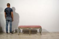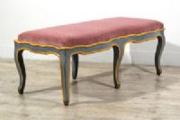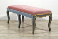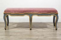 Carved and lacquered wooden bench, Baroque period, Piedmont, mid-18th century Measurements: cm L 120 x D 53 x Seat H 44 Price: confidential negotiation Object accompanied by our certificate of authenticity This bench was made in the Baroque period, mid-18th century, in Piedmont. Made of carved and lacquered wood, it has a lively and sinuous line. The seat upholstered in antique pink velvet is in excellent condition. The wooden structure has a wavy profile with a yellow lacquered thread that surrounds the band under the seat, in light blue color, and the six arched cabriole legs typical of the Baroque style. The bench, originally designed as a wall piece, stands out for its elegance and visual lightness. Very decorative thanks to its delicate color, it can be placed, even in the center of rooms if desired, in entrances, corridors, living rooms or even at the foot of a bed, next to both antique and modern furnishings.