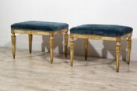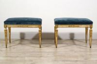 Pair of neoclassical benches, Naples, late 18th century Dimensions: cm W 64 x D 48 x H 50 Price: confidential negotiation Object accompanied by our certificate of authenticity This pair of center benches was made in Naples towards the end of the 18th century, during the neoclassical period. The rectangular seat is lined in blue velvet fabric in good condition. The structure is made of lacquered and Mecca gilded wood, carved on all four sides. The lacquer still has an excellent authentic patina. The band under the seat, bordered by a gilded thread and lacquered in shades of cream, has in the center, in relief, a gilded phytomorphic ornament centered by a flower. The same flower, within a square frame, is carved near the corners, from which the four legs originate. These, from a concave sculpted element, which gives grace, develop as a truncated inverted pyramid. Bordered on the corners in gold, lacquered with the same cream tones in the background, they are enriched by a gilded phytomorphic bas-relief that echoes the decoration of the under-seat band. All the gilded elements are in Mecca. The gilding of wood in Mecca is a type of gilding performed on silver leaf so that it takes on the appearance and preciousness of gold leaf. Mecca is a varnish with an ancient recipe that was jealously guarded in workshops. It involves the use of sandarac gum and gutta gum in alcohol, dragon's blood and other ingredients which, in a mixture together, contribute to the different chromatic elements of Mecca. Elegant and refined, these benches can be placed in different environments, such as entrances and corridors, lounges and rooms, either against the walls or in the center of the rooms, next to antique or modern furnishings. Please note that the benches are stable thanks to a wooden reinforcement intervention carried out in the 20th century.