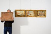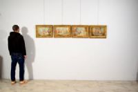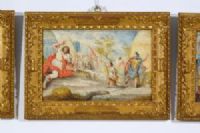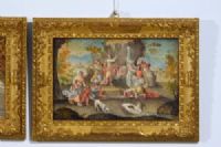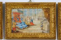 Four paintings depicting biblical subjects, French school, 17th century, tempera on parchment applied to wooden panel. Dimensions: cm H 26 x W 39.5; frame cm H 38 x W 52 x D 4 Price: private negotiation Object accompanied by our certificate of authenticity The four paintings were made in tempera on parchment, applied to a wooden panel, in the 17th century, presumably in the French area. They depict biblical scenes: Bathsheba bathing, David kills Goliath, Esther before Ahasuerus, Moses brings forth water from the rock. The first painting on the left shows a scene set in an elegant garden, with a carved Baroque-style fountain, leafy trees and architecture in the background. In the center, a group of women dressed in classical tunics is gathered around a female figure sitting near a large tub: this is Bathsheba, surrounded by her handmaids. The delicate colors—especially blues, pinks and ochres—create a luminous and serene atmosphere. The scene refers to the famous episode narrated in the Second Book of Samuel: King David, looking from the terrace of his palace, sees Bathsheba washing and is fascinated by her. From this encounter will be born a forbidden relationship and a series of dramatic events that will mark the history of Israel. The painting, however, chooses to represent the moment of the bath as a harmonious and intimate scene, focusing on the beauty and tranquility before the events that will follow. The second painting from the left depicts the decisive moment of the clash between the young David and the giant Goliath. In the foreground, Goliath is represented as faltering and falling backwards, struck in the forehead by the stone cast with the sling. His massive body and red robe give dynamism to the scene. In front of him, the young David has his arm still raised in the gesture of the launch. Around him, soldiers and field tents create a lively military scenario. The image is inspired by the story of the First Book of Samuel, in which David, a simple shepherd, confronts the Philistine champion Goliath armed only with a sling and his own faith. With a quick gesture guided by faith in God, David defeats the giant, marking the victory of Israel and foreshadowing his future role as king. The third painting depicts Queen Esther at the culminating moment of her meeting with King Ahasuerus. The scene takes place in a sumptuous court environment, characterized by a colonnade, a monumental staircase and rich draperies. Ahasuerus, sitting on the throne under a red and blue canopy with lambrequins, extends his arm towards Esther, who faints from the tension while two handmaids support her. In the background, court figures and architectural details complete the regal atmosphere, while the vivid colors and minute details enhance the theatricality of the moment. The scene refers to a passage from the Book of Esther. The young queen, risking her life, appears before the king without being summoned, to intercede on behalf of her threatened people. Due to strong agitation Esther faints, and Ahasuerus, moved to compassion, welcomes her and extends the scepter towards her, a gesture that sanctions his clemency. The painting captures just this dramatic moment, a symbol of courage, intercession and justice. Finally, the last painting depicts the famous biblical episode in which Moses brings forth water from the rock to quench the thirst of the people of Israel during the Exodus in the desert. In the center of the composition, Moses, wrapped in a light cloak, strikes the rock with the staff, while around him men, women and children hurry with containers, kneeling or reaching out to collect the miraculous water. The setting is natural and luminous, with trees and mountains in the background and animal details in the foreground such as the dog and the bird near the stream. The scene refers to the book of Numbers (20:1-11) and Exodus (17:1-7), where Moses, behind divine command, beats the rock in the desert of Meriba to offer water to the people afflicted by thirst. The event is a symbol of trust in God and his providence: the miracle reveals the role of Moses as guide and mediator between God and the Israelites in difficulty. The four parchments, with bright and vivid colors, are very pleasant and decorative. In good condition, they are presented inside Venetian style frames, in carved and gilded wood.