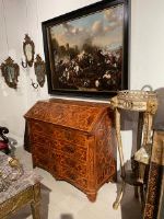 Chest of drawers with drop-front in veneered and inlaid wood, Piedmont, early 18th century Measurements: Height 106.5 cm, width 23 cm, depth 59 cm Price: between €22,000.00 and €24,000.00 Item accompanied by our certificate of authenticity This chest of drawers with drop-front represents the elegant production of Piedmontese cabinet making during the early 18th century. The commode, veneered in elm burl, is finely inlaid on all sides with elegant Baroque geometric motifs, characterized by curls, volutes and spirals in lighter colored wood species, creating chiaroscuro effects that give the furniture great sophistication. The use of burl wood gives a particularly light color, quite unusual for the time and currently very appreciated and sought after. The chest of drawers consists of four large drawers, one of which, the highest one, cannot be opened by sliding as it conceals a secret compartment that can be opened from the upper drop-front. The front is curved, while the straight sides are connected by valuable rounded uprights, also inlaid. The upper part consists of an opening compartment equipped with a small hinged door (called a “drop-front”) which, rotating on pivots, can be lowered and raised as needed. When open, it provides a convenient writing surface, lined in beautiful stamped and original leather, and reveals a series of six small drawers and three open compartments for storing office supplies and small personal items. The commode rests on four shaped and inlaid feet. A shaped and inlaid decorative element is placed centrally at the bottom. The chest of drawers is enriched with original lock escutcheons and handles in burnished and finely chiseled bronze. This chest of drawers can be easily placed in any room of the house, such as the bedroom, study, entrance hall and living room, as well as in representative places such as offices. It is suitable to be combined with antique furnishings and modern style furniture.