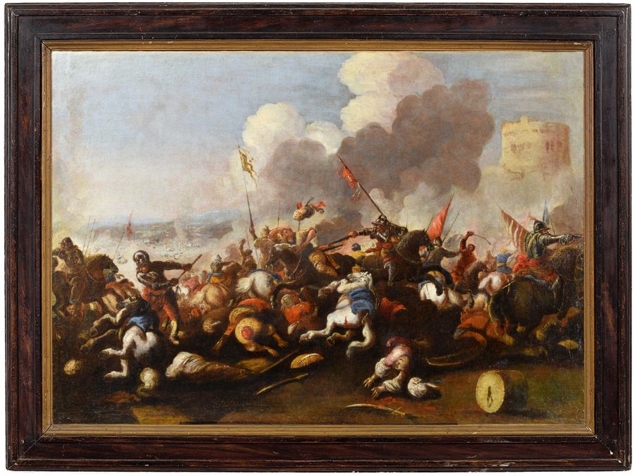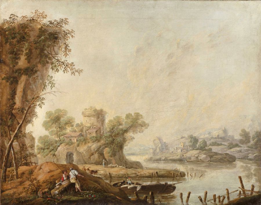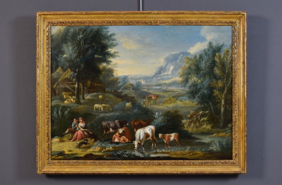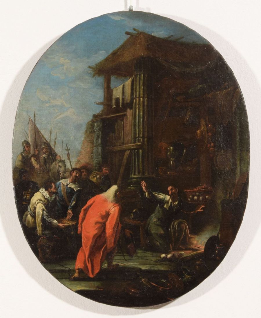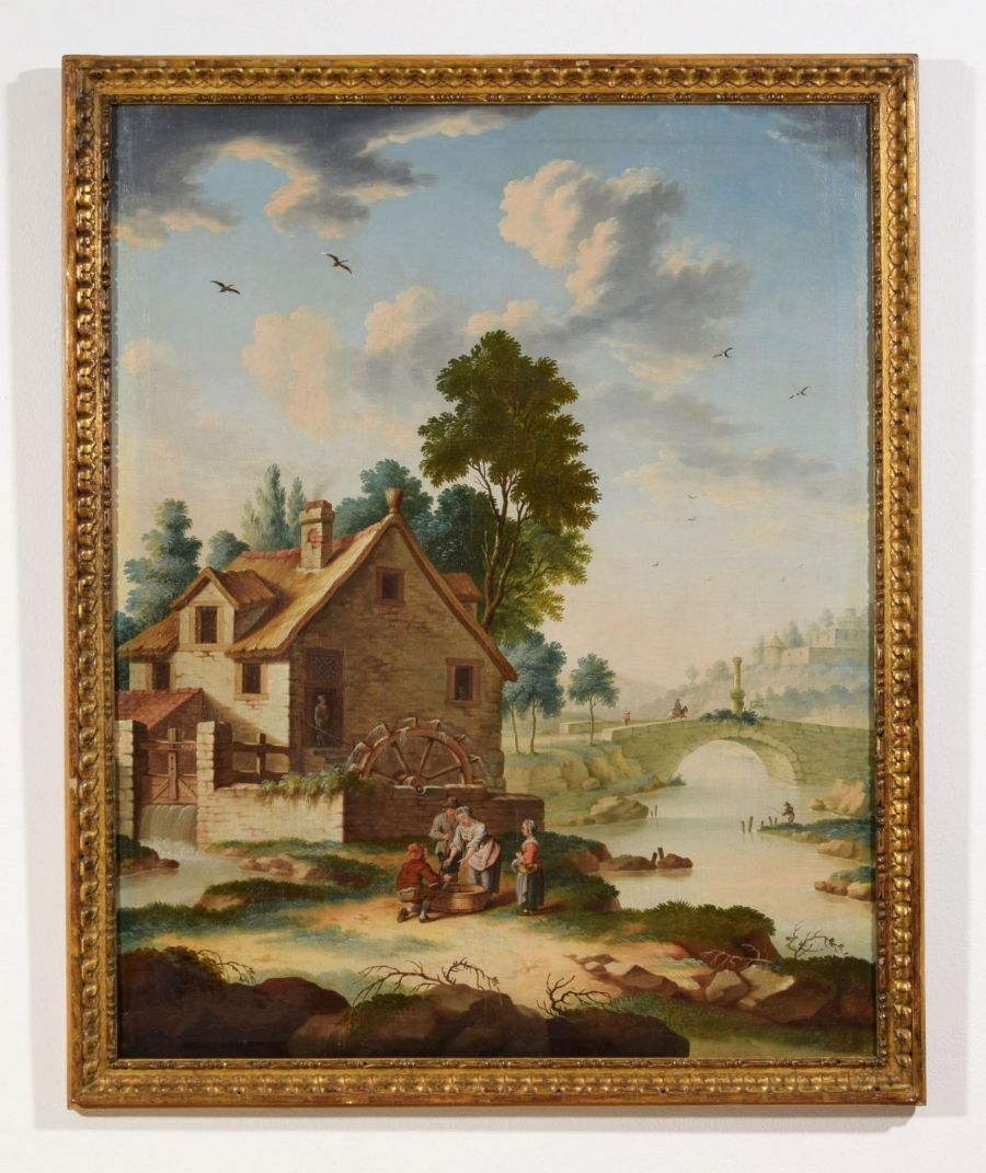 August Querfurt (1696, Wolfenbüttel – 1761, Vienna), Contadini e paesani all’ingresso di un borgo, olio su tavola