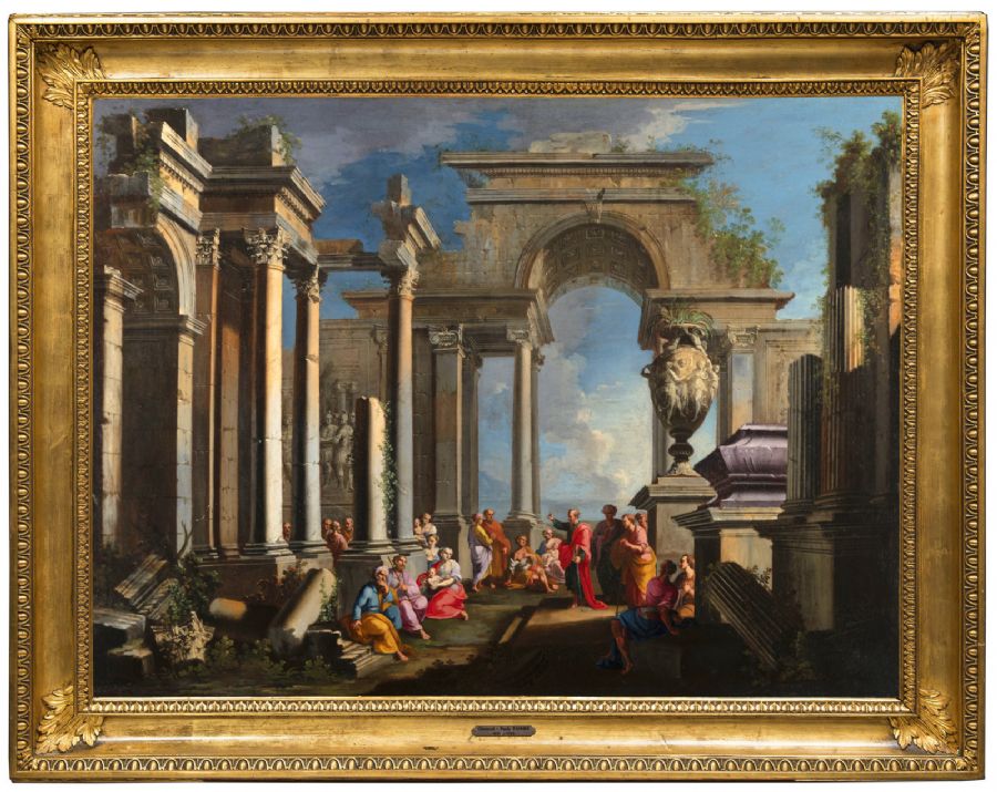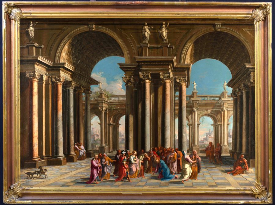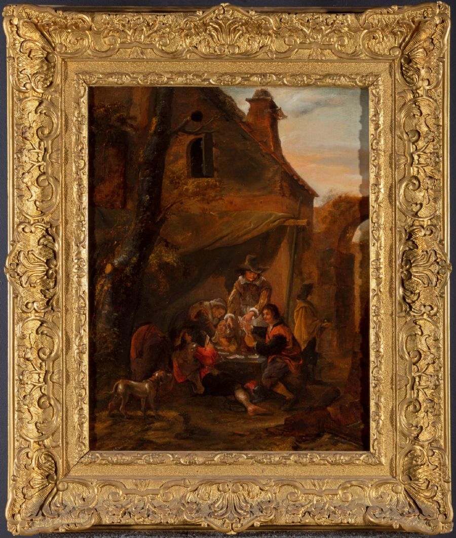 August Querfurt (1696, Wolfenbüttel – 1761, Vienna), Contadini e paesani all’ingresso di un borgo, olio su tavola