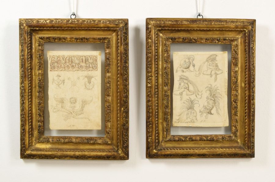 Coppia di dipinti su vetro entro cornice in legno scolpito e dorato, Piemonte, XVIII secolo