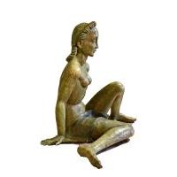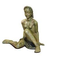 La pregevole scultura, realizzata in terracotta invetriata, è opera della celebre manifattura Lenci di Torino su modello di Helen König Scavini. Di notevoli dimensioni, raffigura una donna nuda, coperta di un solo panno a vita, seduta con le gambe flesse asimmetricamente mentre si sorregge sulle braccia con le mani poggiate al piano. La donna ha un’espressione ieratica, grandi arcate sopraccigliari sotto le quali gli occhi eterei sono socchiusi; le labbra dischiuse nascondono un accenno di sorriso. I capelli sciolti sono rigirati indietro con grandi onde sia sul capo che lungo la schiena. La colorazione dell’invetriatura è sui toni del verde muschiato, che contribuisce a conferire a questa donna l’aspetto di una ninfa o di una figura mitologica. Sotto alla base in terra cotta si trova, dipinto a mano, il marchio della manifattura “Lenci, ITALY”.
