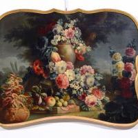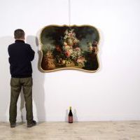 I tre dipinti, realizzati ad olio su tela e presentati all’interno di cornici in legno dorato in stile, raffigurano nature morte con trionfi di fiori e frutta. Le opere sono attribuite all’eccelso naturamortista settecentesco piemontese Michele Antonio Rapous (Torino, 1733 – 1819). Le composizioni sono descritte in spazi all’aperto con alberi ad alto fusto che, in secondo piano, creano una quinta e uno sfondo scuro su cui si stagliano le vivaci cromie dei fiori. Gli insiemi floreali sono inseriti in grandi vasi barocchi, su elementi architettonici ed adagiati a terra. La frutta, meloni, uva, pesche, susine, funghi, è disposta come casualmente a terra o riversa in un canestro di vimini. In primo piano, piante fiorite in contro luce contribuiscono a creare profondità alla scena. Le tele sono un caratteristico esempio della produzione artistica di Rapous, ben rappresentative della sua abilità nella resa compositiva, materica e nel sapiente impiego di una tavolozza vivace, satura e di grande equilibrio.