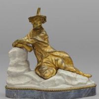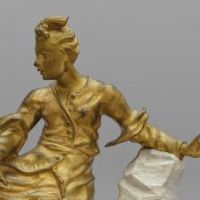 Questa particolare e graziosa coppia di sculture è stata realizzata in Francia nel XVIII secolo. Si compone di due figure, una maschile e una femminile, realizzate in bronzo dorato, adagiate su basi in marmo bianco scolpito a simulare una roccia. Il marmo poggia a sua volta su una base in marmo grigio sagomata, raccordata alla scultura con una fine cornice in bronzo dorato.