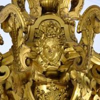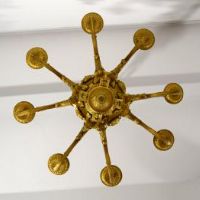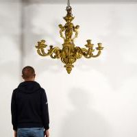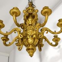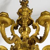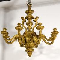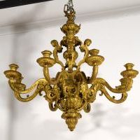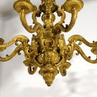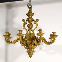 Questo lampadario a otto luci in bronzo cesellato e dorato è stato realizzato in Francia, in stile Reggenza, nella seconda metà del XIX secolo. Molto complesso nel suo insieme per la ricchezza dei decori bronzei si struttura in un elemento centrale decorato da applicazioni a foggia fitomorfa e floreale, teste femminili identificabili con la dea Cerere, volute, foglie d’acanto. I bracci reggicero, mossi e curvilinei, decorati con elementi fitomorfi e decori geometrici, terminano con bobeche circolari baccellate e con decoro a foglia su cui si instaurano i porta candele esagonali, anch’essi finemente cesellati. Il lampadario si sviluppa verso l’alto con elementi ricchi di decorazioni e ornati, tra cui quattro altorilievi a erma su bracci mossi, con testa di fanciullo che sembra affacciarsi per osservare l’ambiente dall’alto. Il lampadario, così ricco di dettagli eleganti e raffinati, appare molto decorativo e di grande effetto scenico, adatto a molteplici ambienti.