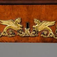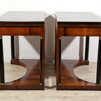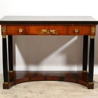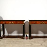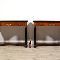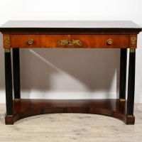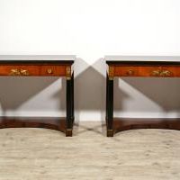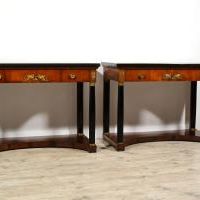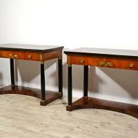 Questa elegante coppia di grandi consolle Impero è stata realizzata nei primi anni del XIX secolo in Toscana. Le consolle hanno un piano di forma rettangolare in legno laccato nero. Sul fronte presentano un grande cassetto in legno lastronato, decorato con prese e applicazioni in bronzo dorato e finemente cesellato. Lateralmente vi sono raffigurate delle cetre con nastri e volute, mentre al centro due grifoni con girali ed elementi fogliati attorniano simmetricamente la bocchetta della serratura. Le consolle poggiano su quattro colonne laccate sui toni del nero, con capitelli e base in bronzo dorato che si innestano su un basamento mistilineo. Per le loro dimensioni importanti e il carattere spiccatamente decorativo, queste consolle sono collocabili in ingressi, corridoi e saloni, nonché ambienti di rappresentanza, adatte ad essere accostate ad arredi antichi e altrettanto in contesti di arredo moderno.