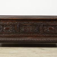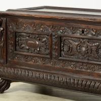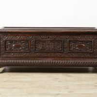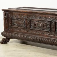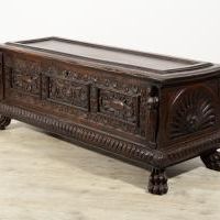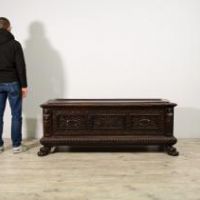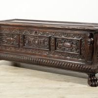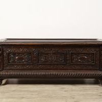 Questa importante cassapanca nobiliare del Rinascimento toscano è stata realizzata verso la fine del XVI secolo. In legno di noce scolpito e intagliato si compone di un piano in asse unico arricchito da una cornice a rilievo modanata e apertura a ribalta. Il fronte è suddiviso in tre riquadri attorno ai quali è scolpita una decorazione a foggia vegetale. I tre riquadri sono decorati con scudi contornati da cartigli, volute e sinuose cornici. In quello centrale campeggia lo stemma della famiglia nobiliare composto da uno scudo araldico “spaccato o troncato, nel primo con tre stelle ordinate in fascia e nel secondo, tre bande oblique; con fascia attraversante la partizione”. Sui lati sporgono scolpite due busti antropomorfi inseriti in lesene con basamento. I fianchi sono intagliati con grande ventaglio scanalato e elemento circolare centrale contornato da foglie d’acanto. Il maestoso basamento baccellato, con foglie angolari, contorna i tre lati della cassapanca ed è sorretto da zampe ferine.