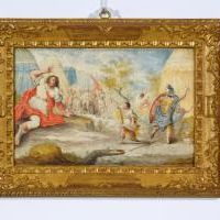 Quattro dipinti raffiguranti soggetti biblici, scuola francese, XVII secolo, tempera su pergamena applicata su tavola lignea