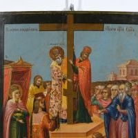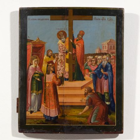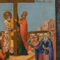 Raffigura la seconda delle grandi feste dell’anno liturgico (14 settembre), ovvero l’Esaltazione della Croce, che consiste nel rinvenimento della Croce di Cristo da parte di Elena, madre di Costantino, a Gerusalemme e la sua esposizione ai fedeli ad opera del patriarca Macario nel 326. L’icona pertanto proviene da un’Iconostasi in cui era probabilmente collocata nell’ordine delle feste.