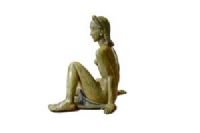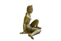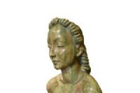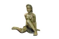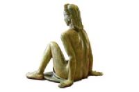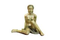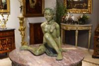 La pregevole scultura, realizzata in terracotta invetriata, è opera della celebre manifattura Lenci di Torino su modello di Helen König Scavini. Di notevoli dimensioni, raffigura una donna nuda, coperta di un solo panno a vita, seduta con le gambe flesse asimmetricamente mentre si sorregge sulle braccia con le mani poggiate al piano. La donna ha un’espressione ieratica, grandi arcate sopraccigliari sotto le quali gli occhi eterei sono socchiusi; le labbra dischiuse nascondono un accenno di sorriso. I capelli sciolti sono rigirati indietro con grandi onde sia sul capo che lungo la schiena. La colorazione dell’invetriatura è sui toni del verde muschiato, che contribuisce a conferire a questa donna l’aspetto di una ninfa o di una figura mitologica. Sotto alla base in terra cotta si trova, dipinto a mano, il marchio della manifattura “Lenci, ITALY”.