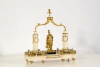 La raffinata architettura si compone di un base mistilinea con profilo mosso in marmo bianco poggiante su otto piedini in bronzo dorato. La base simula una porzione di architettura con gradini e balaustra realizzata in bronzo traforato e dorato. Su di essa poggiano alle due estremità, su basi quadrangolari in marmo nero del Belgio, due colonne decorate da elementi in bronzo dorato. Sulle loro sommità poggiano due tendaggi in bronzo dorato di un baldacchino, che culmina con un grande pennacchio in bronzo e cupola in marmo. Al centro della base e accanto alle colonne si erge la scultura di un soldato romano, vestito con armatura e impugnante uno spadino estratto dal fodero.