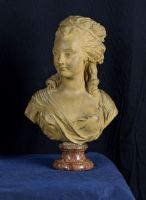 Il raffinato busto, realizzato in terracotta, raffigura una nobildonna abbigliata secondo la moda della metà del XVIII secolo in Francia. La graziosa giovane donna ha i capelli raccolti secondo il gusto che si diffuse alla corte di re Luigi XV. Indossa un abito semplice che si adagia sulla scollatura. Il busto reca la firma di Augustin Pajou Paris ed è datato 1765. La scultura poggia su una base in marmo a sezione circolare.