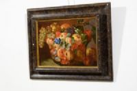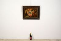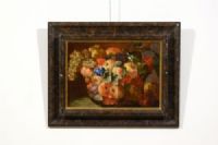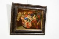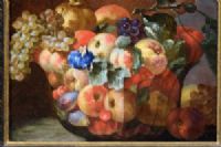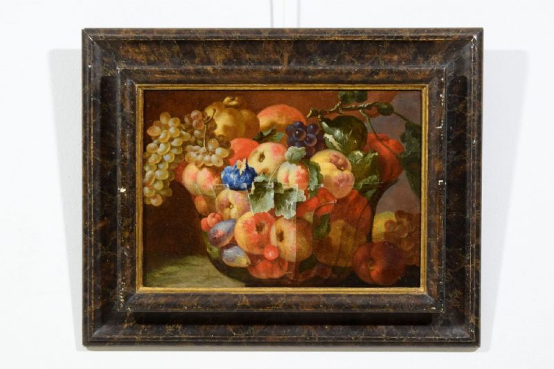 Il dipinto, di pregevole qualità e realizzato ad olio su tela, raffigura una Natura morta con composizione di frutta. Uva bianca e nera, pesche, fichi, mele cotogne sono descritte all’interno di un bacile in vetro la cui trasparenza è resa magistralmente grazie a fini lumeggiature che ne risaltano i riflessi della luce. La composizione occupa tutta la tela; uva, foglie di vite e alcuni frutti posti al di fuori del bacile sono raffigurati parzialmente, cose se fuoriuscissero dalla visuale dell’osservatore e dalla cornice. Escamotage tipicamente barocco che ne accentua la teatralità e l’abbondanza, verso una composizione non statica e coinvolgente. Poco traspare dell’ambiente in cui la frutta è descritta; questa infatti è illuminata da una luce proveniente da sinistra che risalta i colori e le forme grazie ad un sapiente uso delle ombre, anche molto pronunciate.
