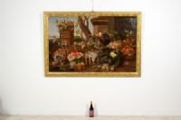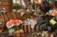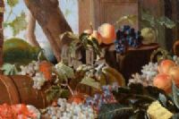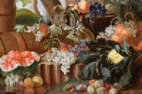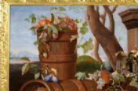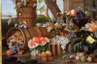 Il dipinto, realizzato ad olio su tela, raffigura una natura morta con una rigogliosa composizione di frutta adagiata in uno spazio all’aperto con botti in legno, cesti di vimini ed elementi architettonici. L’opera è chiaramente attribuibile a Pietro Navarra, artista attivo a Roma dal 1685 al 1714. Gli ultimi studi sulla pittura di questo artista si devono a Ulisse e Gianluca Bocchi il cui lavoro aiuta a definire lo stile e il percorso artistico di Navarra. Pittore eclettico, allievo di Franz Werner von Tamm (Amburgo, 1658 – Vienna, 1724) e di Christian Berentz, amburghese attivo a Roma nel primo ventennio del Settecento, si distinse per la raffigurazione di nature morte.