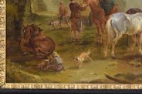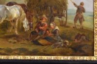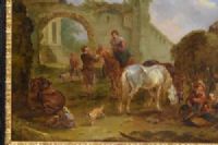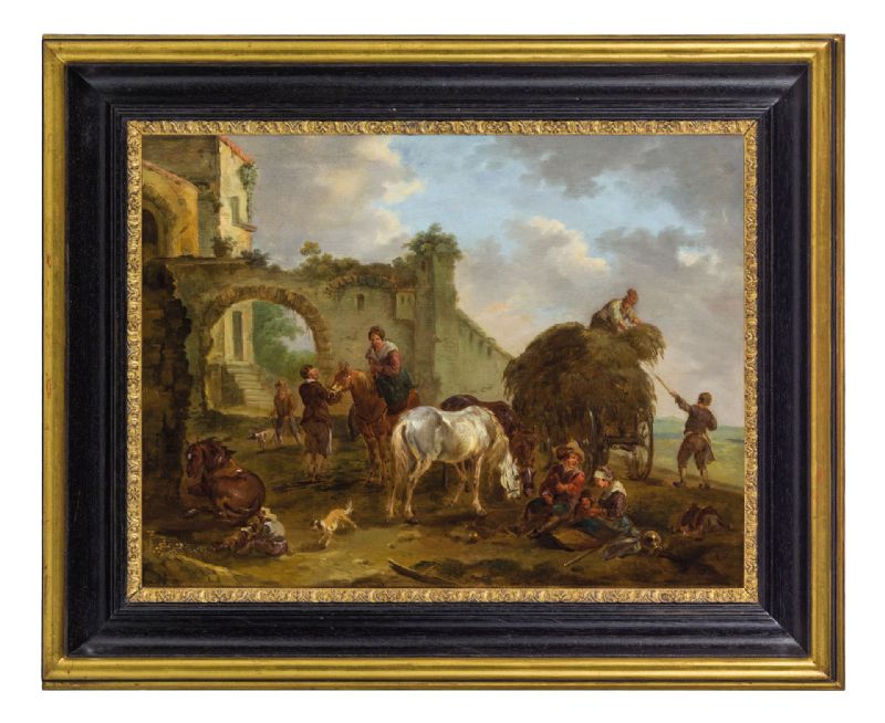 Il pregevole dipinto, dal grande impatto cromatico grazie alla tecnica dell’olio su tavola, raffigura una vivace scena di vita quotidiana di campagna, ambientata vicino alla porta di ingresso di un borgo. L’episodio di vita campestre, raffigurato con grande vitalità, mediante l’utilizzo di tocchi rapidi e materici di colore, illustra destra, alle porte del borgo, un carro carico di fieno e due contadini all’opera. Avanti a loro siedono alcune figure che sostano accanto ai loro cavalli. Una donna sul suo cavallo raggiunge un passante mentre dietro un pastore cammina con accanto il suo cane. Sulla sinistra siede di schiena un bambino intanto a giocare con dei cagnolini vicino ad un cavallo, che riposa seduto. L’ingresso al borgo è caratterizzato da una un varco ad arco tra mura antiche, descritte con poetico rovinismo, oltre al quale si affacciano alcune abitazioni. Il cielo, sereno, è segnato da qualche nuvola bianco grigia. L’opera è firmata con le lettere A.Q. in basso a destra, riconoscibile nel monogramma che Georg Kaspar Nagler segnala nel suo celebre volume come appartenente al pittore August Querfurt. La sua descrizione ci informa che il “Pittore di battaglie di Wolfenbuttel (Germania), allievo di suo padre Tobias, dipingeva nello stile del Borgognone. In alcune delle sue opere, in cui sono raffigurate anche le battute di caccia, si trovano le iniziali del nome. Fu pugnalato per mano di J. Burdé e A. Balzer. Questo maestro morì a Vienna nel 1761”. Il confronto stilistico con le opere firmate e ricondotte dalla critica alla mano di Querfurt mostrano analogie sia nella tecnica caratteristica dell’artista, che nella cromia utilizzata e nella scelta dei soggetti. Si possono riconoscere alcuni caratteri tipici delle bambocciate del maestro quali la stesura del colore, con pennellate disinvolte e veloci dimostrandosi abile, attraverso le lumeggiature, nella resa dei volumi e delle profondità. Il pittore descrive con cura i diversi protagonisti, le loro gestualità e gli indumenti; attenzione che indica uno studio dal vero della vita quotidiana, letta e interpretata con naturalismo. August Querfurt nacque a Wolfenbuttel, Vienna nel 1696 ed è principalmente conosciuto per i suoi soggetti raffiguranti soldati e scene di battaglia, certamente influenzate dalla pittura di Philips Wouwerman. Istruito da suo padre, Tobias Querfurt, pittore di paesaggi e animali alla corte di Brunswick, successivamente studiò con Georg Philipp Rugendas (Augusta 1666-1742) ad Augusta. Nel 1752, Querfurt divenne membro dell'Accademia di Vienna. Ebbe importanti committenze, come testimoniano, tra altre, le dodici tele, alcune di grandi dimensioni, realizzate per il duca Carlo Alessandro di Württemberg e gli otto dipinti commissionati dall’imperatrice Maria Teresa raffiguranti eventi bellici relativi alla guerra di successione austriaca (1740-1748). Le opere per l'imperatrice sono ora ospitate nel Museo di Storia Militare situato a Vienna. Querfurt visse in un periodo molto turbolento: il Sacro Romano Impero, l'Impero Ottomano, gli Asburgo, la Gran Bretagna e un certo numero di altre forze combatterono diverse battaglie vicine a Vienna dove Querfurt viveva. Nella capitale austriaca morì nel 1761. Alcune sue opere sono oggi esposte al Belvedere Palace di Vienna, alla Galleria Nazionale di Augusta, altri sono a Berlino, Dresda, Stoccarda e Bratislava. [...] In conclusione, il ritrovamento di quest’opera unita al riconoscimento del monogramma, consente di aggiungere al corpus di opere di August Querturt una pregevole testimonianza delle sue capacità tecniche e la conferma che fu un valente pittore anche di soggetti diversi al genere delle battaglie a cui in passato era esclusivamente ricondotto.