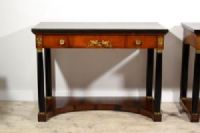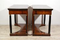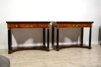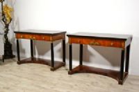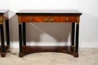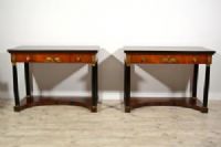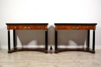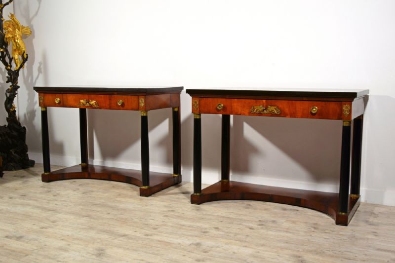 Questa elegante coppia di grandi consolle Impero è stata realizzata nei primi anni del XIX secolo in Toscana. Le consolle hanno un piano di forma rettangolare in legno laccato nero. Sul fronte presentano un grande cassetto in legno lastronato, decorato con prese e applicazioni in bronzo dorato e finemente cesellato. Lateralmente vi sono raffigurate delle cetre con nastri e volute, mentre al centro due grifoni con girali ed elementi fogliati attorniano simmetricamente la bocchetta della serratura. Le consolle poggiano su quattro colonne laccate sui toni del nero, con capitelli e base in bronzo dorato che si innestano su un basamento mistilineo. Per le loro dimensioni importanti e il carattere spiccatamente decorativo, queste consolle sono collocabili in ingressi, corridoi e saloni, nonché ambienti di rappresentanza, adatte ad essere accostate ad arredi antichi e altrettanto in contesti di arredo moderno.