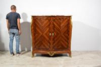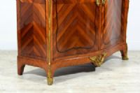 Presenta un piano realizzato con un marmo particolare, dalla struttura complessa, con profilo modanato e mosso e con gli angoli anteriori lobati, leggermente aggettante rispetto al mobile. La struttura lignea della credenza è interamente lastronata. Presenta sul fronte due ante che celano un vano con due ripiani. Le ante esteriormente, ed internamente, sono lastronate in bois de rose che crea, con le sue sfumature, un raffinato gioco cromatico, impreziosito da un intarsio a filetto mosso in palissandro, che disegna girali, elementi fitomorfi e decori fogliati. L’interno del mobile è completamente lastronato in bois de rose, dettaglio raro e di grande prestigio. I due ripiani sono in legno di mogano massello, realizzati in epoca posteriore. I montanti della credenza, la fascia sottopiano e la fascia inferiore che include le quattro gambe sono lastronati in legno di viola, mentre i riquadri al centro dei fianchi sono nuovamente in bois de rose, riprendendo il disegno cromatico del fronte. La credenza è impreziosita da bronzi finemente cesellati e dorati di alta qualità e di gusto rocaille. Le applicazioni bronzee comprendono le bocchette delle serrature, un ornato posto al centro della fascia inferiore e sui montanti, ove originano dal di sotto del piano, con una voluta, e proseguono con ornati fogliati verso il basso, percorrendo tutto il perimetro dello spigolo per giungere a decorare i piedi con ornati fitomorfi e rocaille (sabot). I bronzi che definiscono gli angoli anteriori della credenza hanno la duplice utilità di proteggerli e illuminare la struttura con la doratura, rendendola preziosa e leggiadra.