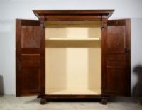 Questo affascinante armadio in legno di noce massello scolpito è stato realizzato nel XVII secolo in area toscana. La struttura si contraddistingue per due ampie ante frontali ornate da formelle geometriche che conferiscono movimento e decorazione. Il basamento è realizzato con un elegante profilo a mensola, dunque sporgente. Altrettanto la cimasa dell'armadio è aggettante, conferendo un aspetto armonioso e ben bilanciato. Lateralmente agli sportelli, in prossimità dei montanti, due fasce lignee son finemente intagliate con decoro geometrico. I piedi anteriori sono scolpiti a foggia ferina. L’interno dell’armadio prevede un grande vano, foderato in tessuto ancora in buono stato e utilizzabile, suddiviso da una barra appendiabiti e un ripiano in legno anch’esso foderato. La ferramenta è coeva.