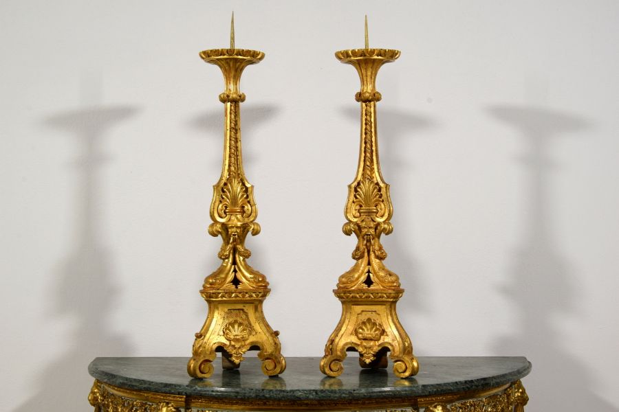 Coppia di candelieri neoclassici in legno intagliato e dorato, Genova, fine XVIII secolo